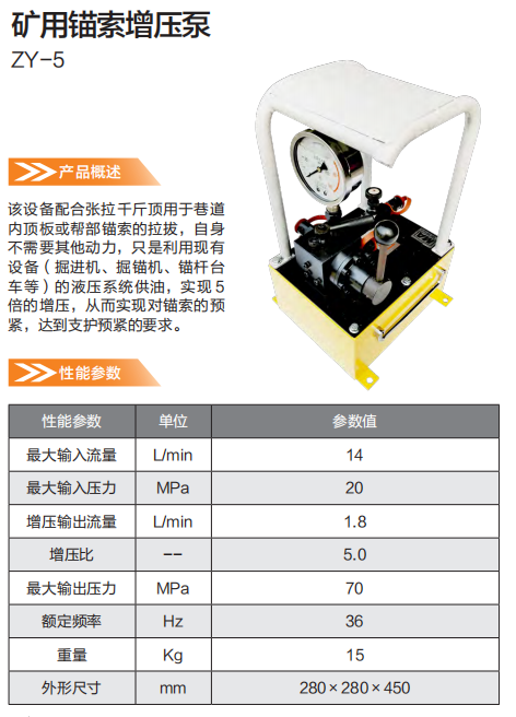 礦用錨索增壓泵。該設備配合張拉千斤頂用于巷道內(nèi)頂板或幫部錨索的拉拔,自身不需要其他動力,只是利用現(xiàn)有設備(掘進機,掘錨機,錨桿臺車等)的液壓系統(tǒng)供油,實現(xiàn)5倍的增壓,從而實現(xiàn)對錨索的預警,達到支護預警的要求。